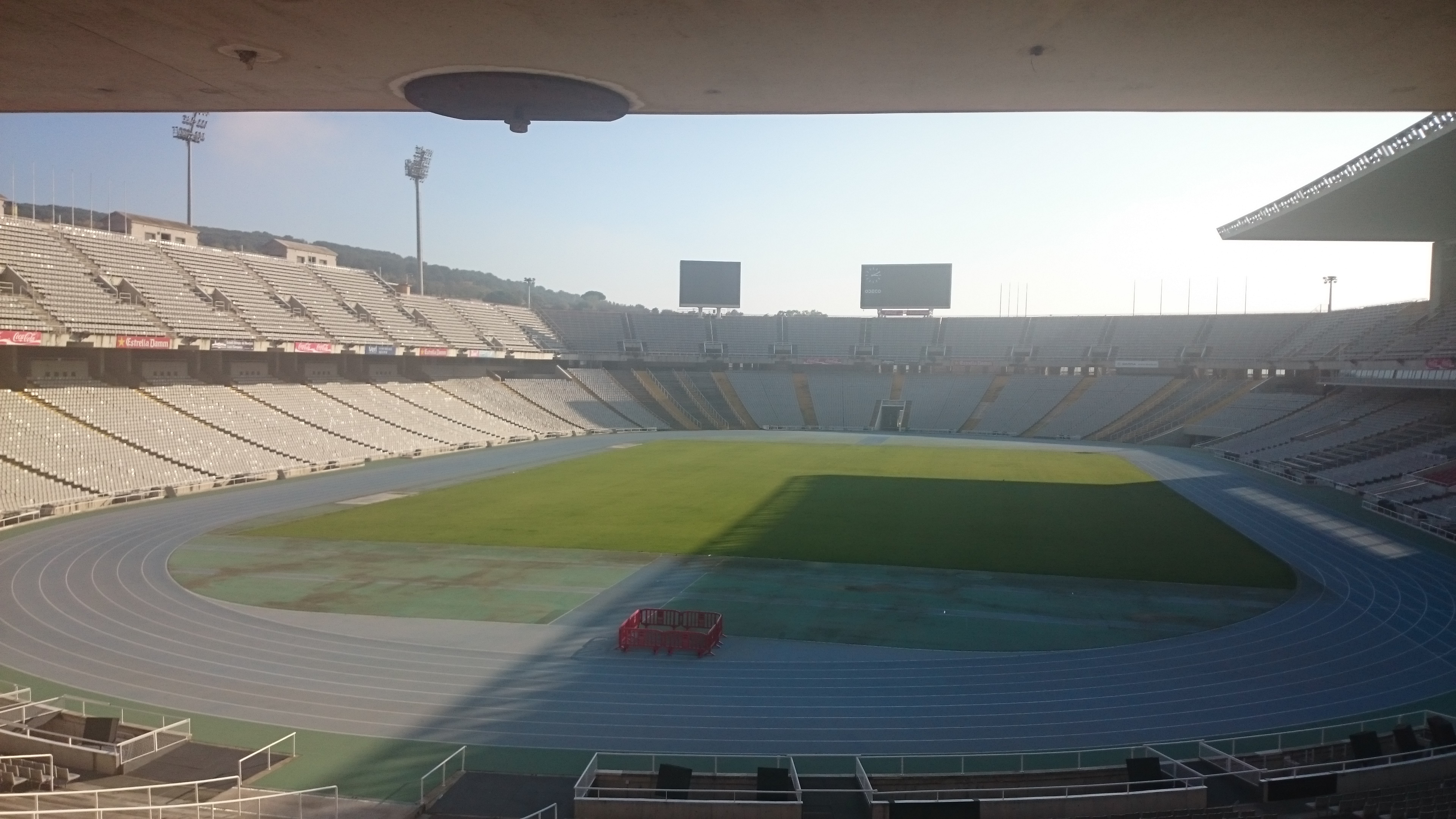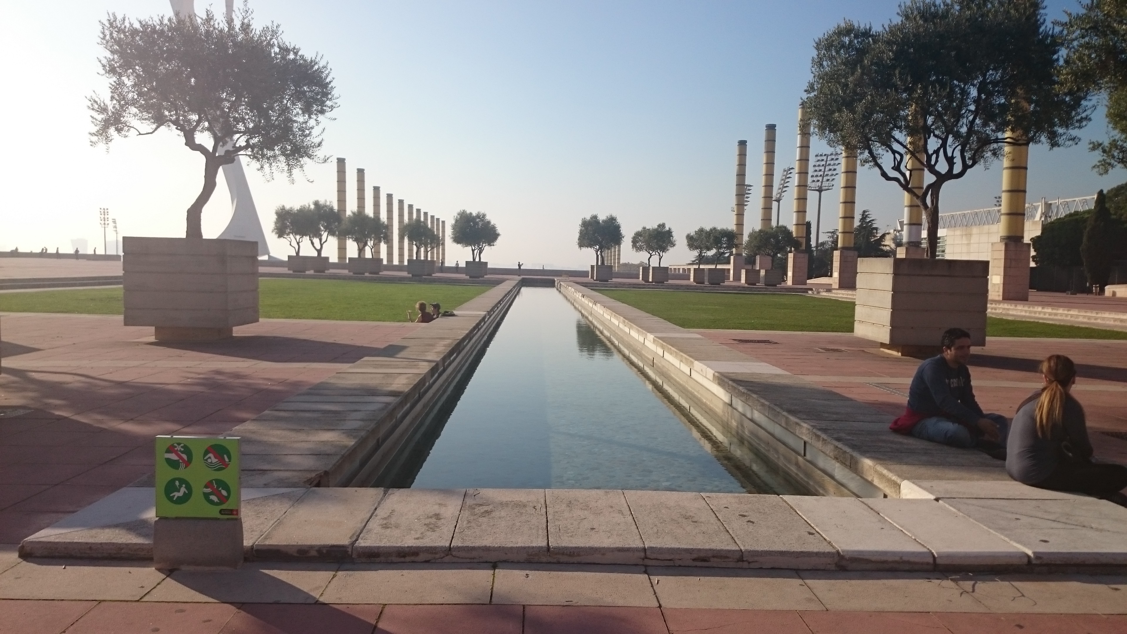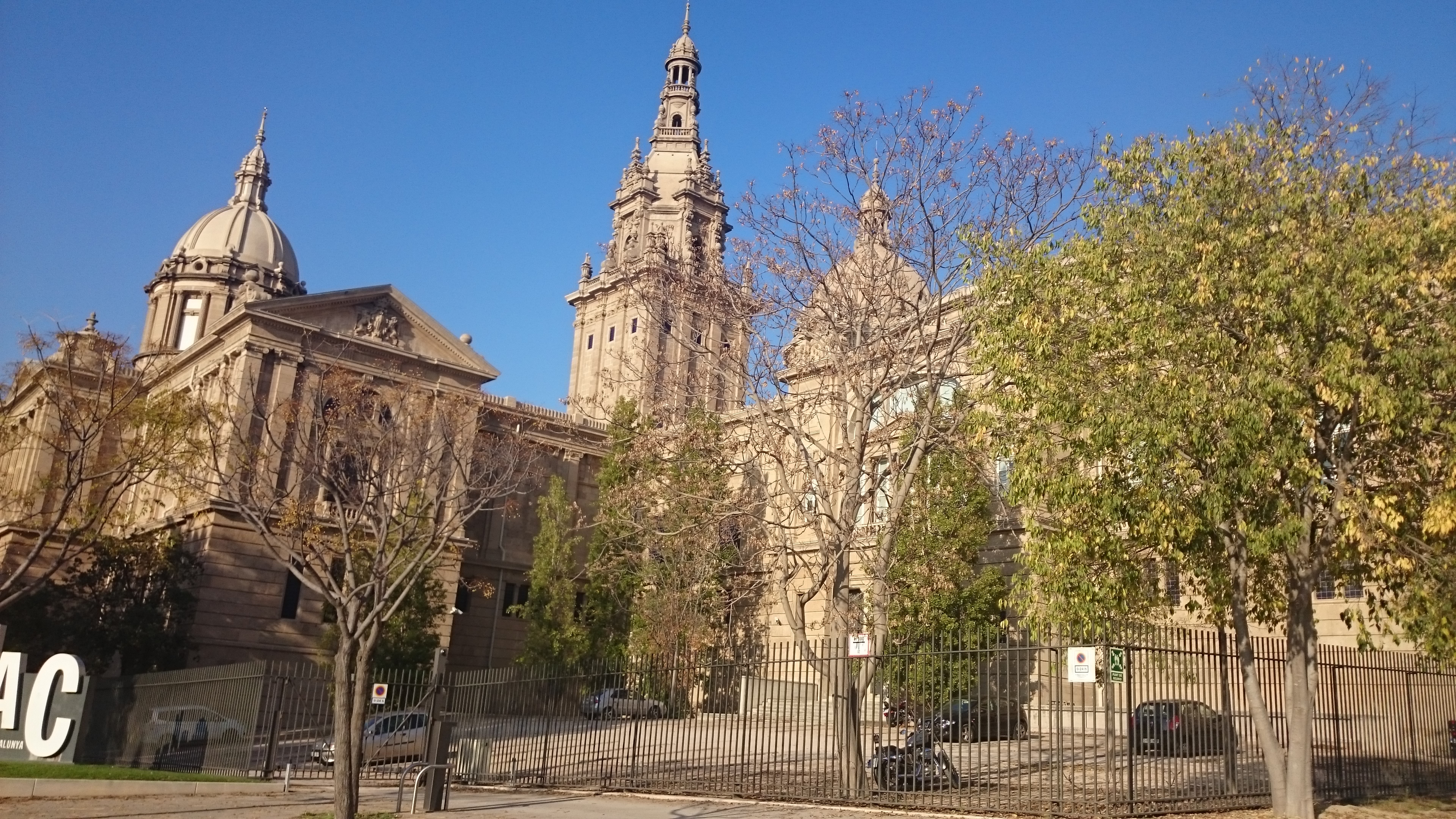 Wcześniej, po śniadanku, postanowiliśmy wybrać się jednak wyżej. Gdy byliśmy w okolicy portu, dostrzegliśmy wagoniki kolejki linowej, które prowadziły ponad morzem, gdzieś wyżej… Później okazało się, że wjechaliśmy na Wzgórze Montjuic. Nim tam jednak dojechaliśmy, odstaliśmy w sporej kolejce, najpierw do kasy, by kupić bilety, potem do windy, by wjechać na wieżę „ajfla”, skąd odjeżdżała kolejka – wagonik, żywcem wyjęty z XIX wieku. Cały ten czas zastanawialiśmy się, czy warto. Mgła dziś skrywała słoneczko i baliśmy się, że wycieczka, może okazać się mało widowiskowa. Błąd! Gdy wreszcie, po niemal godzinie, dostaliśmy się na wzgórze, poczytaliśmy w przewodniku, że tam właśnie w roku 1992 odbywała się olimpiada. Stadion olimpijski i inne jego obiekty powstały właśnie tam. Majestatyczne budowle, jakże inne od tych, które serwuje nam XXI wiek. Miło było widzieć to wszystko, i jeszcze coś ponad to. Niesamowity widok z tarasów muzeum sztuki katalońskiej, rozpościerający się na całą Barcelonę. Pan B., w swej łaskawości, „schował” na chwilę mgłę i pokazał nam te widoki. Dech zapierały.