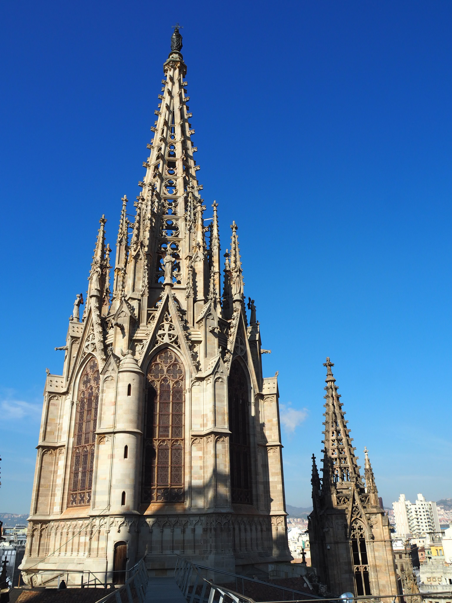 – Uff – pomyślałem, starzejemy się, trzeba będzie nam jutro wsiąść do barcelońskiego turystycznego autobusu, którym podróżują głównie Niemcy i Japończycy (ci pierwsi czasem z psami). Ale niepewność trwała tylko chwilkę. Po rozgrzewce wróciliśmy do formy. Po kilku pętelkach trafiliśmy do pierwszej napotkanej świątyni, od razu jak się okazało katedry – La Seu, górującej wielkością nad miastem. Katedry z biegającymi gęsiami w środku, od św. Eulalii (patronki miasta). Piękna, monumentalna, gotycka budowla. Za trzy Euro od głowy wspięliśmy się na jej „dachy”, a że było południe, odczucia były niezwykłe, cudowne, niebieskie niebo i wszystkie wieże kościelne jak okiem sięgnąć w Barcelonie, każda na swój sposób, oznajmiała nam południe.