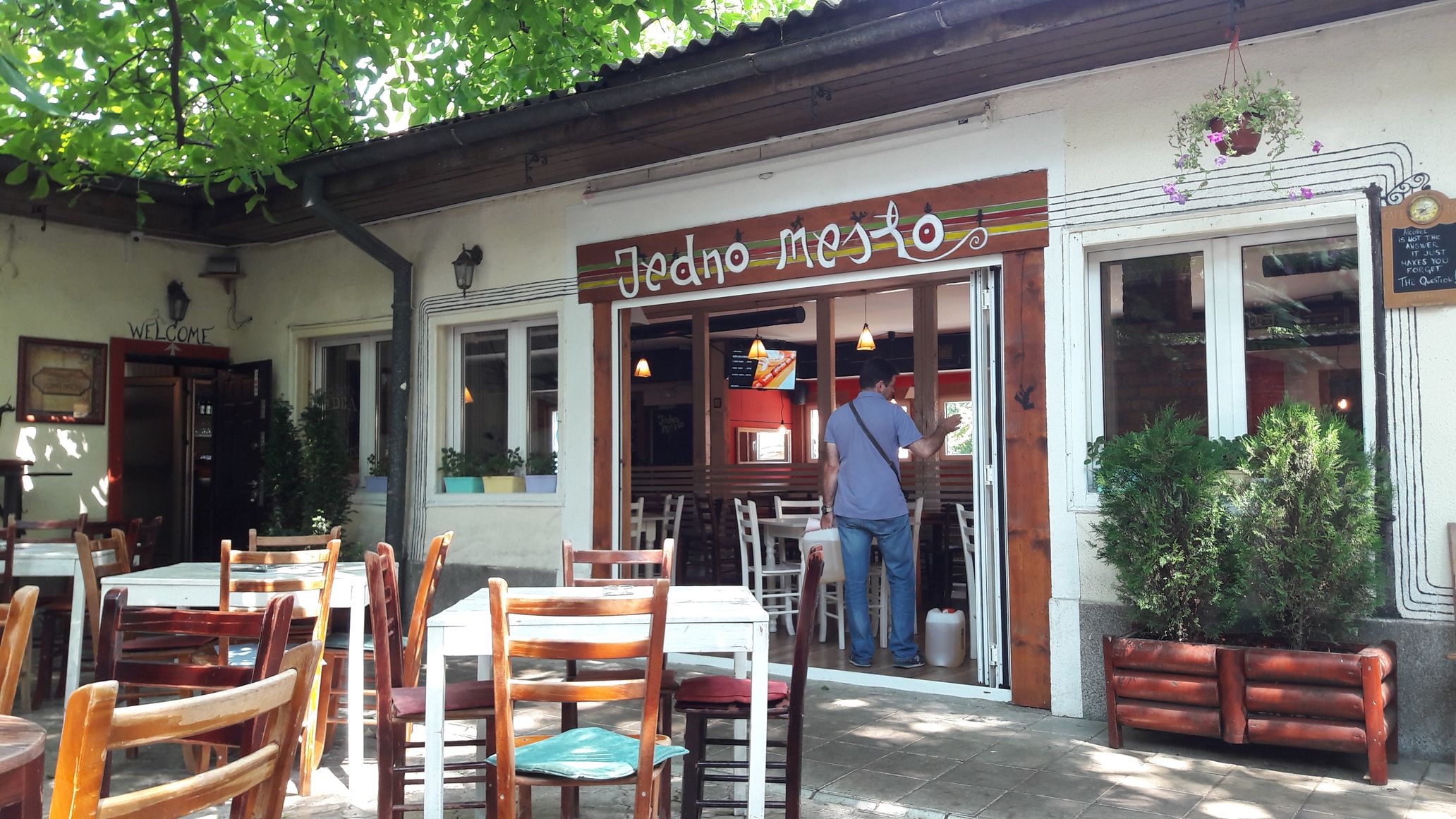 Tak też się stało w poniedziałkowy poranek. Nasz hostelik proponuje swym gościom, śniadanka w pobliskiej knajpce o ślicznej nazwie „Jedno mesto”. Znakomity lokal, polecany przez „Tripadvisora”. Obudziwszy się, pobiegliśmy dwie przecznice dalej i usiedliśmy przy stoliczku, na świeżym powietrzu, pod ogromnym orzechowcem. Zaproponowano nam wybór jednego z ośmiu zestawów śniadaniowych. A co znaczy śniadanie po serbsku, domyśleć się może ten, kto choć raz otarł się o kulturę śniadaniową w tej części Europy. Nam, natychmiast przypomniało się śniadanie w Tbilisi. Śniadanie z deserem. Tu podobnie. Jeszcze wczoraj, przy wejściu, nasz gospodarz Iwanek zapytał, czy jemy mięso. Tak, odparliśmy. A on odetchnął z ulgą. Wieczorem wracając, z kolacji napomknąłem małżonce, że przez miesiąc ne jemy tyle mięsa, ile tutaj przez 5 dni. Rzeczywiście, trudno znaleźć lokal serwujący cokolwiek innego.