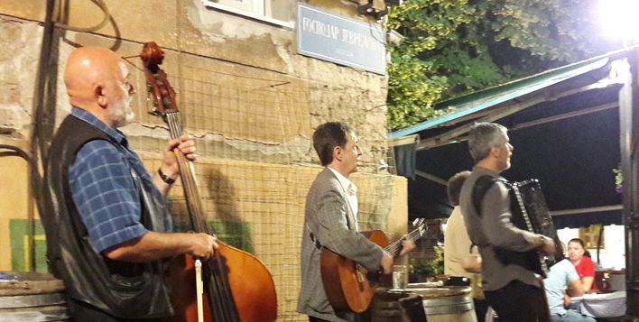 Wieczór to znowu marsz ku fortom, już nie w takim upale. Potem kolacja. I nie da się nie opowiedzieć gwar i znowu muzyka. Dzisiaj zjedliśmy w pobliskiej, „wypasionej” restauracji. Obiad, dla dwóch osób, to koszt ok. 2400 serbskich dinarów, co w przeliczeniu, jakieś 75 zł. Na tej ulicy, temu podobnych knajp było co najmniej z 5. Wszędzie stoliki pod gołym niebem, i do czego zmierzam – towarzyszące klientom kapele. Zespoły na ogół 5 osobowe . Gitara, akordeon, bas, często fagot. Znakomicie to wygląda. Podchodzą do stolika i śpiewają razem z gośćmi swoje piosenki. Dostając w zamian jakieś napiwki. Nikt nie protestuje, wszyscy się świetnie bawią. Śmieszy tylko zwielokrotniony efekt stereo, gdyż każdy z zespołów – naprawdę świetnie grających – gra coś zupełnie innego. Nikomu to jednak nie przeszkadzało. Nam udało się rozpoznać tylko jeden utwór, znany z Bregivicia, w kilku różnych wersjach, a oryginalnie nosi tytuł zdaje się „ederlezi”.