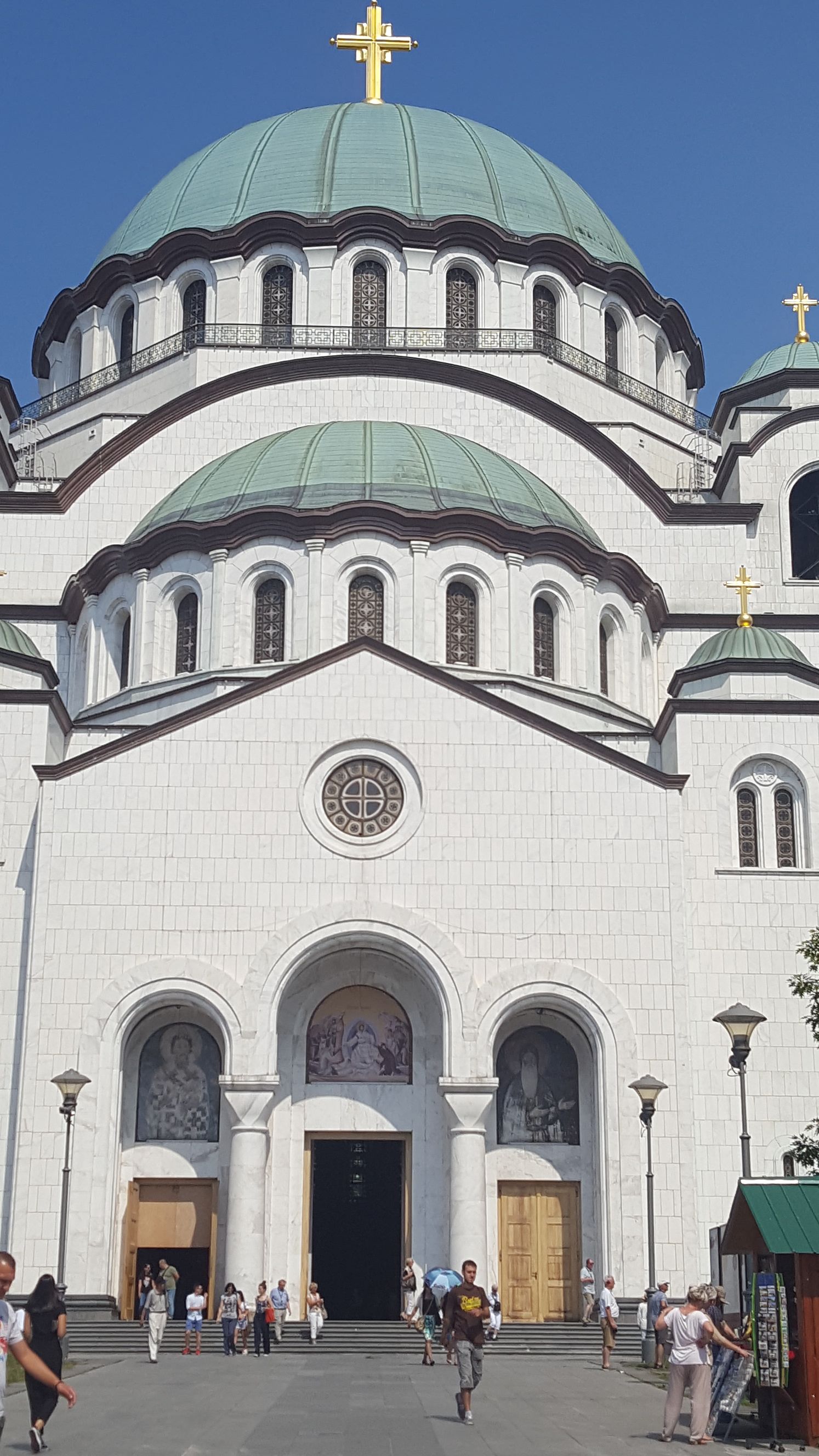 Kościół Świętego Sawy, jedna z największych cerkwi na świecie. Położona na płaskowyżu Vracar, na którym też stoi Stare Miasto i Twierdza Belgradzka. Święty Sawa był założycielem Serbskiego Kościoła Prawosławnego, kościół powstał w miejscu, gdzie w 1595 roku osmański wezyr Sinan Pasza spalił jego szczątki. W większości zbudowany został w latach 1985-1989, jednakże prace wykończeniowe w środku trwają do dzisiaj i do ukończenia jeszcze trochę brakuje (stan na 2016 roku). Owa monumentalna budowla, wysoka na 79 metrów, otoczona jest parkiem, w którym fontanna i mniejszy kościół, a także Biblioteka Narodowa. W ostatnich latach niewielu turystom udało się doń wejść. Kościół jest bowiem nieustanie remontowany. My jednak weszliśmy do środka, co prawda niewiele zobaczyliśmy. Większość ścian przykrytych jest jeszcze foliami, i oddzielonych od części dla zwiedzających. Faktem jest że cerkiew budzi ogromne wrażenie swą wielkością i majestatem. Czynne dla zwiedzających są jej podziemia krypta, odnowiona, ozłocona. Daje przedsmak tego, jak będzie wyglądała cerkiew św. Sawy po remoncie. Gdyby nie jeszcze stado krzykliwych chińczyków, nie czułych na żadną religię. Chcących po prostu zrobić sobie fajną focię, przy którejś z pięknych ikon. To jednak naród bardzo karny. Wszedł, narobił hałasu i jedno klaśnięcie kierownika wycieczki wystarczyło, by nastała błoga cisza. Chińczycy wyszli. I wreszcie można pokontemplować piękno o chłodek podziemi.