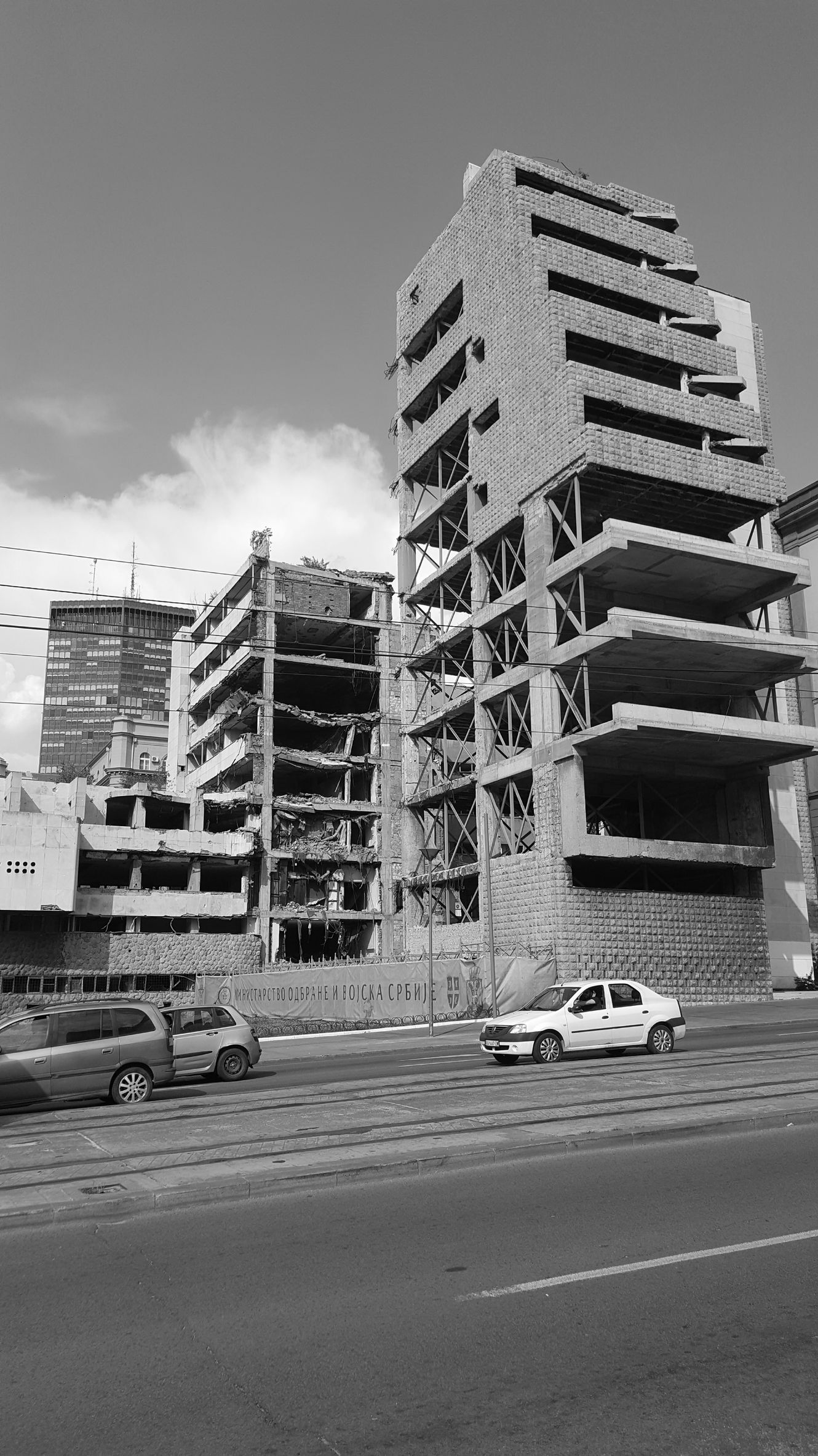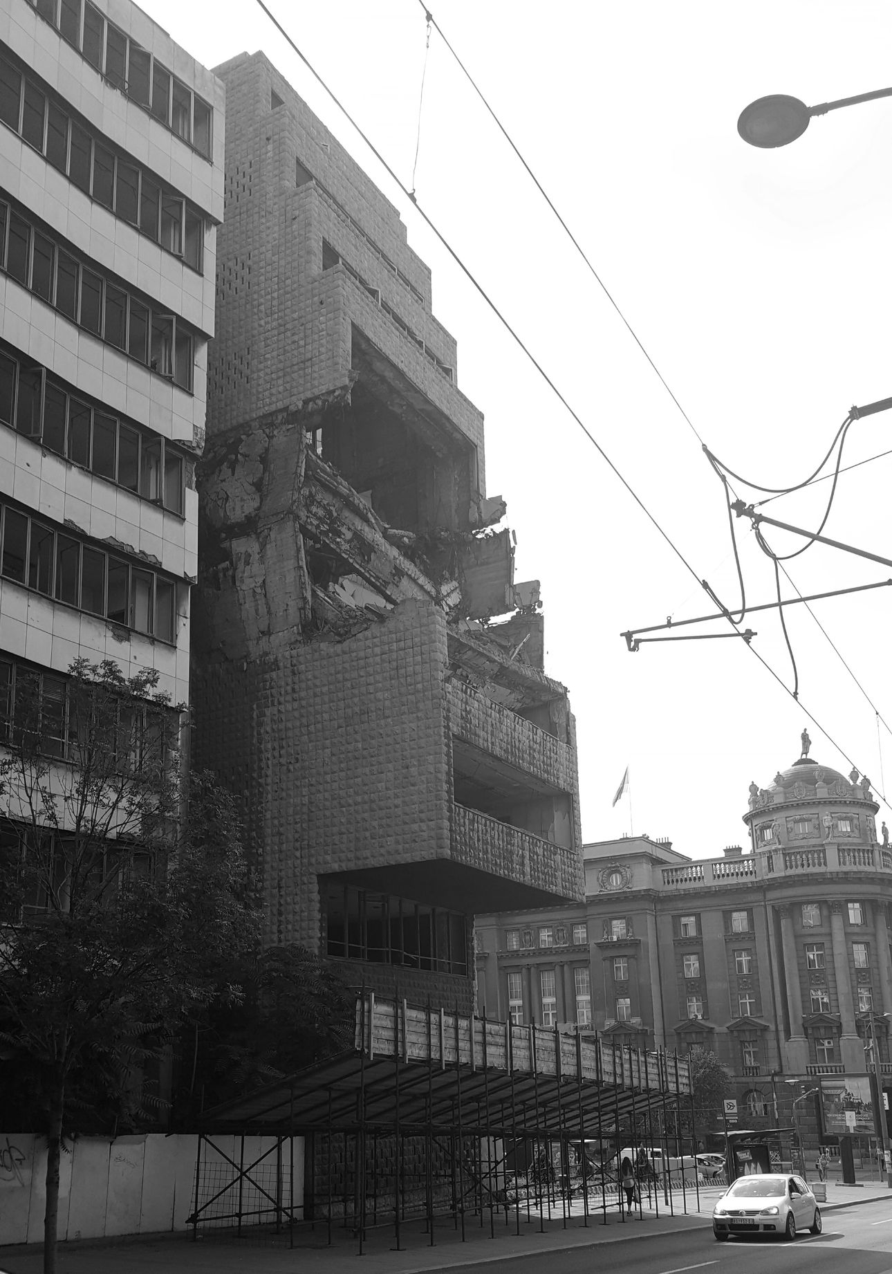 Prosto z kościoła powędrowaliśmy pieszo do „Nato bombing buildings”. Brzmi trochę śmiesznie, ale po głębszym zastanowieniu włos się jeży. Można sobie wyobrazić, a działo się to przecież w 1997 roku, w mieście tak bardzo podobnym do Warszawy, Krakowa czy Gdańska. Wojska NATO precyzyjnie ostrzelały z samolotów kilka obiektów wojskowych w stolicy Serbii, trochę, by nieco przywołać niesfornych i dumnych Serbów do porządku. Niestety, albo dla nas fotografujących – stety, takie miejsca do tej pory można zobaczyć w Belgradzie. Była to pierwsza interwencja militarna uzasadniana koniecznością obrony praw człowieka – naloty podjęto w obronie mniejszości albańskiej w Kosowie. Przechodziliśmy obok jednego z takich budynków i nie było nam do śmiechu. Te rany w Serbach jeszcze długo się nie zabliźnią.