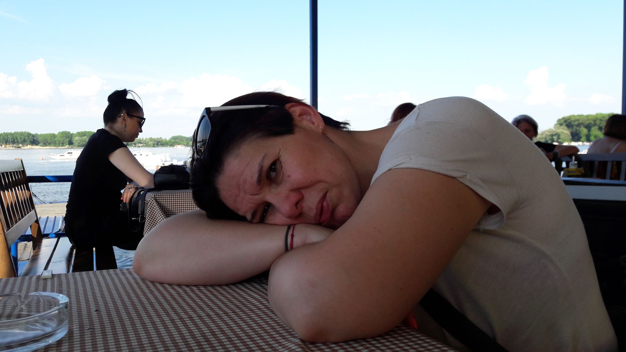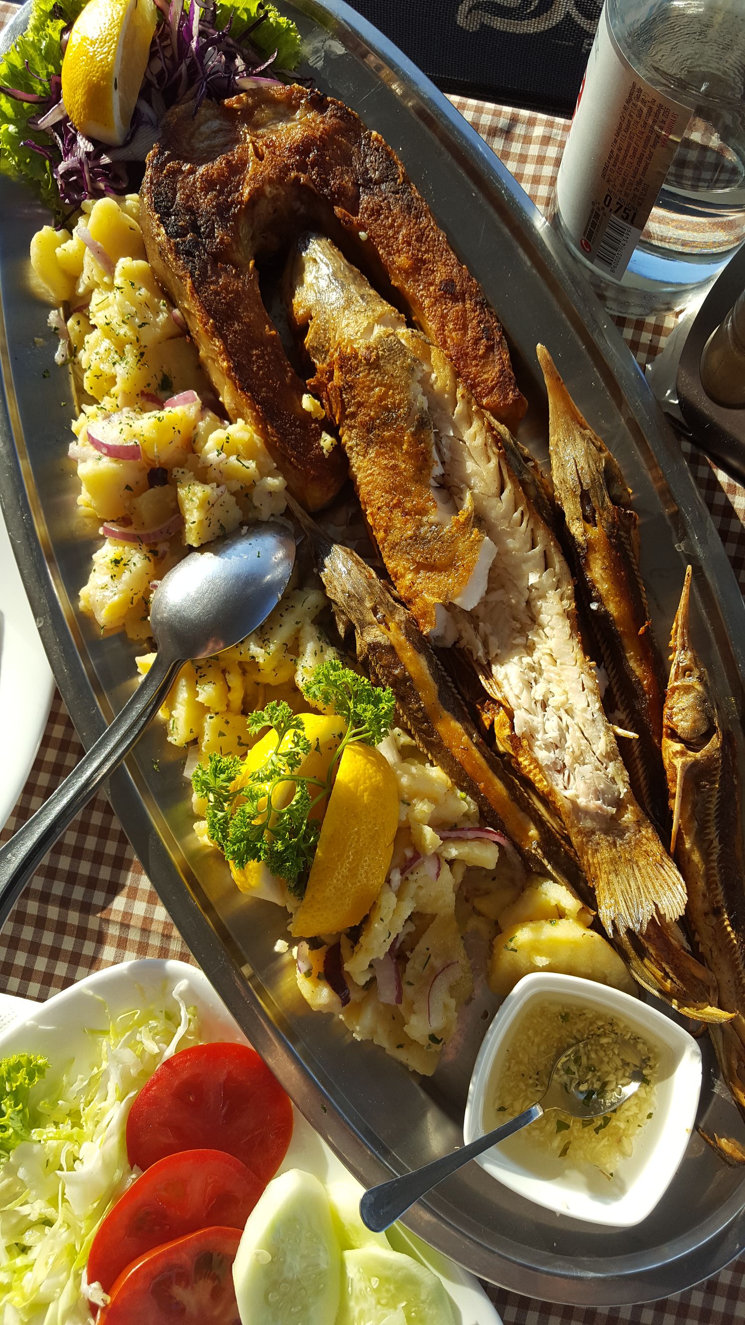 Kulminacją pobytu miała być rzecz jasna restauracja rybna. Należało w tym celu znaleźć odpowiedni lokal, tuż przy brzegu, a najlepiej na barce. Wzdłuż Dunaju, a więc również przez Belgrad ciągnie się kilku dziesięciokilometrowa ścieżka rowerowa, od Węgier, aż po Bułgarię. Na odcinku belgradzkim jednak postanowiliśmy znaleźć bar rybny. Wybór padł na łajbę, na którą prowadził dość długi bezpieczny trap. Z zewnątrz dochodziły głosy i widać było ludzi. Jak się wkrótce okazało była to zapewne jedna z bardziej ulubionych knajp piwno rybnych dla tubylców. My sami, z trudem, na migi, zamówiliśmy rybę. Nie wiedząc zaś jak wytłumaczyć pojęcie „frytki”, wspomnieliśmy bezradni o pokrojonych kartoflach i smażeniu. W konsekwencji dostaliśmy i frytki i jakąś dziwną sałatkę z gotowanymi ziemniakami z cebulą… Małżonce smakowała wyśmienicie. Ja pozostałem przy frytkach. I do tego ogromny półmisek tutejszych ryb. Mało identyfikowalny, za to smaczny i rzeczywiście ogromny!