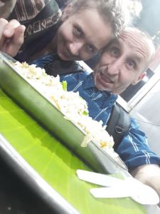 Przystanki w sumie były dwa. Jeden z powodu niestrawności Magdy. Drugi z powodów konsumpcyjnych. O pierwszym nie będziemy się rozpisywać, bowiem każdy z nas może już niebawem czegoś podobnego doświadczyć. Drugi przystanek wart jest krótkiego opisu. Bar był przydrożny, przypominający nasze bary mleczne. Weszliśmy. Cała sala Hindusów jedzących rękoma. Menu w ich języku. My trochę mało ogarnięci, ale wzbudzający zainteresowanie. Jeden z obsługujących natychmiast się nami zainteresował. Kazał streszczać się jakimś biedakom, jedzącym przy najbliższym pięcioosobowym stoliku, bo przecież my mieliśmy tam usiąść. Można domniemać, że taaakich gości, mury tego baru mlecznego al ’la hindi, nie widziały. Usiedliśmy i drobna konsternacja. Co zjeść? My, z Tośką obstawiliśmy zupy. Ja – grzybową, Tośka pomidorową w połączeniu z pitą z masłem. Pozostałą część grupy wybrała jakieś maczanki ryżowe, o różnych smakach i różnych stopniu ostrości. Obsłużeni – iście po królewsku. Natychmiast poczuliśmy się zapiekowani serdecznością i gościnnością. Ryżu pod dostatkiem, znakomitej jakości. A za pięcioosobowy obiad (wegetariański, ku radości Tośki) zapłaciliśmy równowartość mniej więcej 10 USD. Co prawda zamieniłem się na zupki z moją najlepszą chrześnicą, gdyż kolendra nie należy do moich ulubionych ziół.