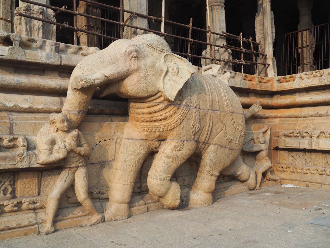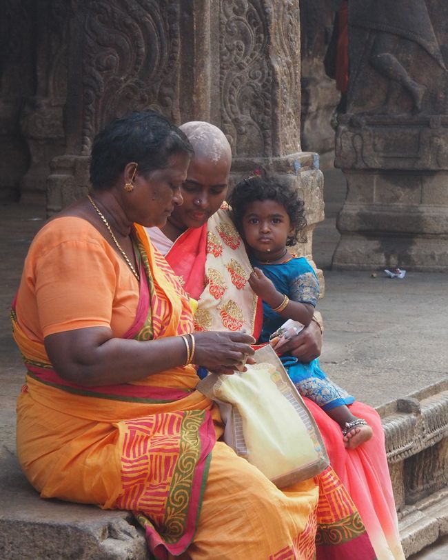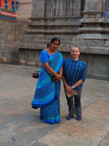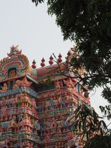 Spóźnieni podążaliśmy do naszej świątyni. Tam zaś niespodzianka. Spotkać i przewodniczyć po świątyni miał nam gospodarz naszej tegorocznej wizyty w Indiach. Po przyjeździe okazał się, że Padmini Ramkumar, jest po prostu … kobietą. Miłą, przyjazną Hinduską, która miała nas oprowadzić po największej hinduskiej świątyni, poświęconej Bogu Wisznu. Kompleks świątynny Sri Ranganathaswamy składa się dziewięciu, zawierających się kolejno w sobie prostokątów wyznaczonych wysokim murem, na którym wybudowano wielkie wieże. Główna świątynia znajduje się w najbardziej wewnętrznym prostokącie i dotarcie do niej może być bardzo trudne ze względu na tłumy pielgrzymów, którzy marzą o tym samym. Cały obiekt uznaje się za największy kompleks świątynny na świecie. 700 letnia sala 1000 kolumn to ogromny płaski dach wsparty na 953 granitowych filarach. Nie mogło w niej zabraknąć różnorakich kapliczek i posążków, z którymi wiążą się różnorakie obrządki i zachowania pielgrzymów.