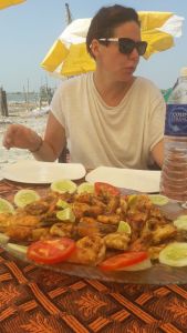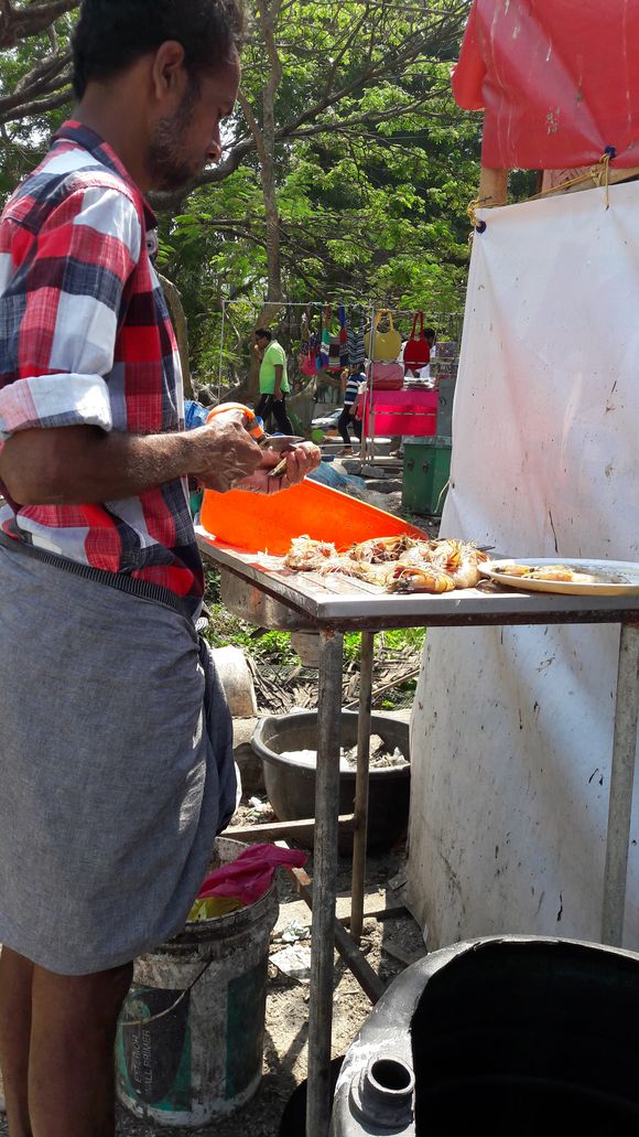 Jako, że było przedpołudnie, swoje skarby sprzedawali przy plaży rybacy. Od nich kupiliśmy za całe 600 rupii krewetek. Przy rybaku stał kucharz, który zabrał nas do swojej knajpki, gdzie przyrządził nam je tak, jak chcieliśmy, w czosnku i imbirze. Uczta krewetkowa pełną gębą.