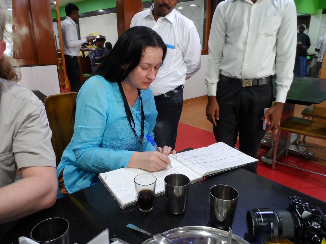 Na lunch zamarzył nam się kurczak, ale nie byle jaki kurczak. Kiedyś na północy jedliśmy tzw. „daba”. Smażone w całości kurcze, na pełnym ogniu. Tu odpowiednikiem tego miał być „tandori chicken”. I tu całą historię objaśniliśmy Panu Prabhu, by po chwili stanąć przed barem, proponującym tego typu pyszności. Tam dopiero zaczął się cyrk! Sensacja, prawdziwa sensacja. Pięcioro białasów zstąpiło i zechciało zamówić coś do jedzenia. Obsługa w pełnym składzie gotowa spełnić każde nasze pragnienie. Rejestrowali oczami każdy nasz kęs. Komentowali, kręcili głowami i uśmiechali się z każdego kąta Sali. Kierownik sali kilka razy prosił o możliwość sfotografowania się z nami, potem przyniósł jakieś zdjęcie, malowidło nawet, byśmy na jego tle zrobili z nim kolejną fotką. Czuliśmy się, jak gwiazdy Bollywood. By wreszcie na koniec poprosić nas o wpis w księdze gości. Niektórzy z czytających te słowa określili by to jednoznacznie. Poczuliśmy się „achnięci”.