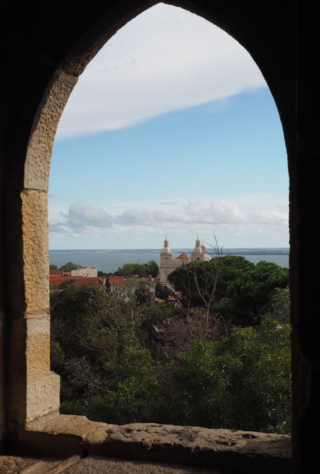 Kolejnym miejscem był zamek Maurów – Castelo dos Mauros. Najpierw autobus dokonywał niemal ekwilibrystycznych ewolucji, by dostarczyć kolejnych turystów pod zamek. Potem zaś oni sami musieli wykazać się sporą kondycją, aby wejść na sam szczyt zamku. Strome wejścia na kolejne wieżyczki były sporym wyzwaniem. Pałac wznieśli rzecz jasna Maurowie. A o tym, że przejął go pierwszy, chrześcijański król Portugalczyków, świadczyć ma postawiona u jego podnóży kapliczka, niezwykle surowa w swej wymowie, choć moim zdaniem nieco mało gustownie zadaszona, już współcześnie. Nagrodą, dla tych wszystkich którzy wejdą na najwyższe wzniesienia miał być wspaniały widok, na okolicę, na całą Lizbonę. Niestety tego dnia pogoda nie była zbyt łaskawa. Łażenie po świetnie zachowanych średniowiecznych murach i warowniach musiało więc nam wystarczyć.