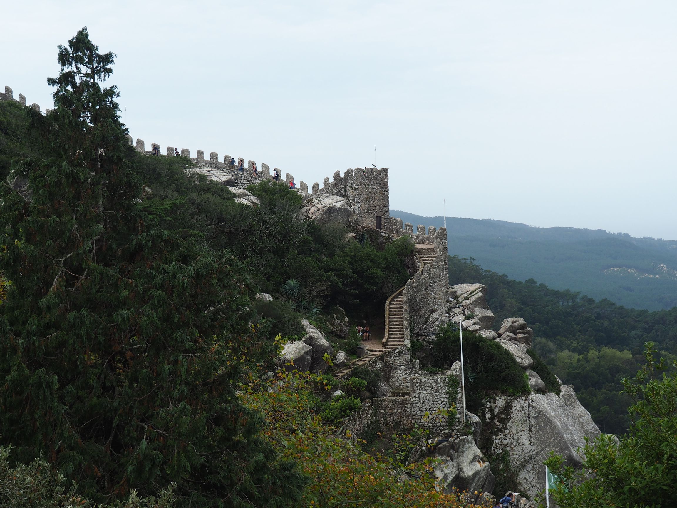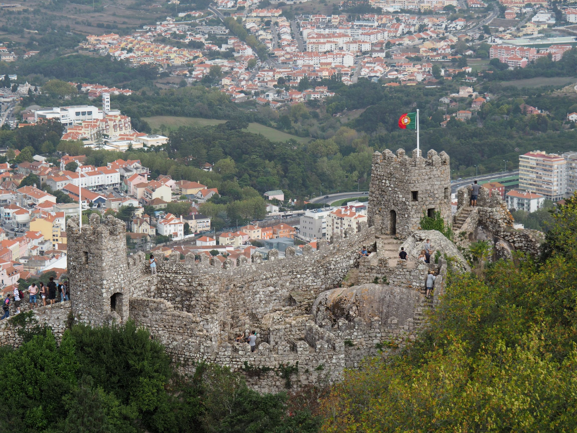 Kolejnym miejscem był zamek Maurów – Castelo dos Mauros. Najpierw autobus dokonywał niemal ekwilibrystycznych ewolucji, by dostarczyć kolejnych turystów pod zamek. Potem zaś oni sami musieli wykazać się sporą kondycją, aby wejść na sam szczyt zamku. Strome wejścia na kolejne wieżyczki były sporym wyzwaniem. Pałac wznieśli rzecz jasna Maurowie. A o tym, że przejął go pierwszy, chrześcijański król Portugalczyków, świadczyć ma postawiona u jego podnóży kapliczka, niezwykle surowa w swej wymowie, choć moim zdaniem nieco mało gustownie zadaszona, już współcześnie. Nagrodą, dla tych wszystkich którzy wejdą na najwyższe wzniesienia miał być wspaniały widok, na okolicę, na całą Lizbonę. Niestety tego dnia pogoda nie była zbyt łaskawa. Łażenie po świetnie zachowanych średniowiecznych murach i warowniach musiało więc nam wystarczyć.