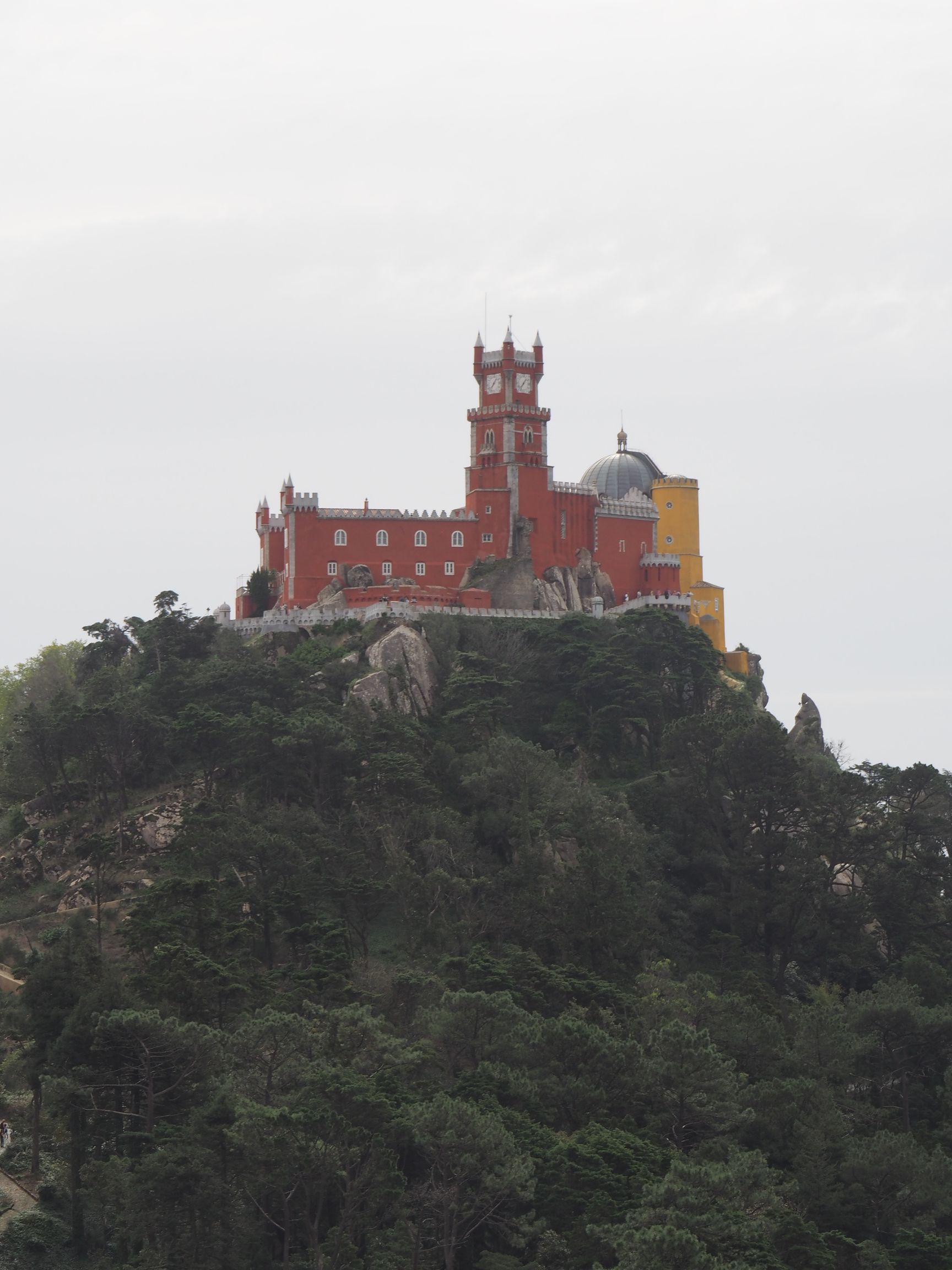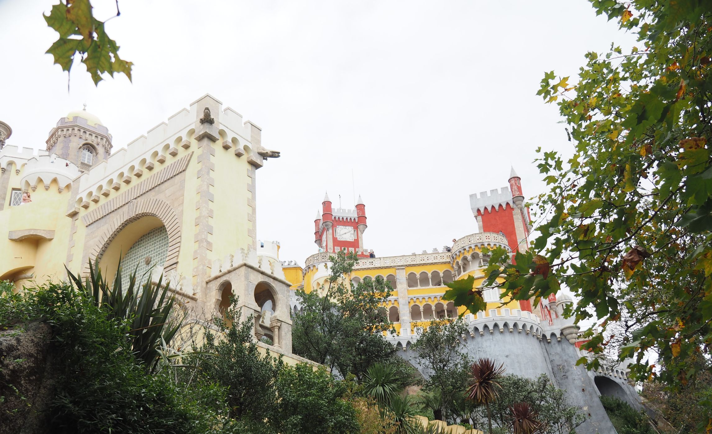 Ostatnim celem, który wyznaczyliśmy sobie w Sintrze był Pałac Pena, czyli Palacio de Pena razem z parkiem- Parque de Pena. To jak określają przewodniki, jedna z najbardziej niezwykłych budowli w Portugalii. W swojej estetyce, gdy patrzymy na nią z daleka, przypomina „disnejowską” kolorową budowlę. To jednocześnie obiekt postawiony najwyżej z pozostałych. Obiecany z niego widok miał nas jeszcze bardziej zachwycić. Najbardziej zdumiewać może kolorystyka fasad poszczególnych wież i murów. Całe wieki były one po prostu szare. Dopiero niedawno konserwatorzy powrócili do barw, jakie były w zamyśle twórców pałacu. W roku 1838 król Ferdynand II, czyli Ferdynand II Koburg, a po portugalsku Fernando Augusto Francisco António de Saxe-Coburgo-Gotha rozpoczął prace rekonstrukcyjny starego klasztoru. Zastąpił on m.in. czternaści cel mnichów dużymi pomieszczeniami, które zostały ozdobione obrazami. W roku 1843 król zdecydował o rozbudowie Pałacu Pena i rozkazał budowę nowego skrzydła – tzw. Nowego Pałacu. Pałac imponuje i zachwyca, w całym słowa znaczeniu.
