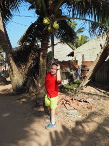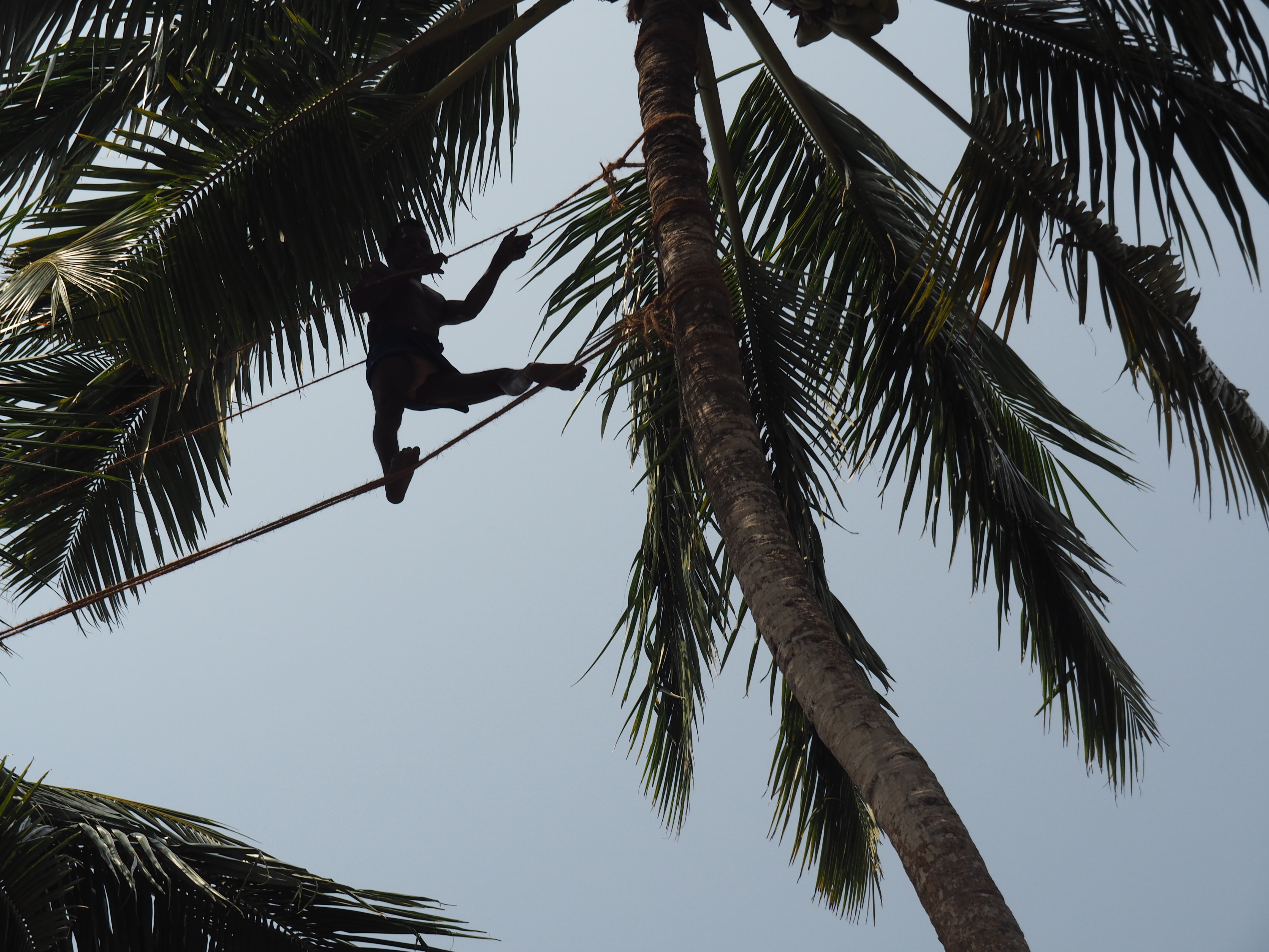Przypadkiem, podczas przystanku na siusiu, Kusumi opowiedział na o powstawaniu naszego ulubionego trunku na Sri Lance – aracku. Trunek ów wykonywany jest z kwiatów palmy kokosowej. Nic w tym niezwykłego, bo i trunek przedni i palmy dość powszechne na wyspie. Pozostaje tylko zdobyć owe kwiaty. Poznaliśmy człowieka, który od ponad trzydziestu lat zajmuje się pracą arcy niebezpieczną. Wchodzi na wysokie palmy i po sznurkach przechodzi na te sąsiednie, z których również zrywa tak pożądane kwiaty. Człowiek małpa chciałoby się rzec, lecz piszę te słowa z szacunkiem. Rozmawiałem chwilę z człowiekiem, który pokazywał mi urazy i zniekształcenia na swoim ciele. Nawet nie pamiętał ile razy spadł z wysokiej palmy. Za swoją pracę, zarabia jakieś dwieście dolarów miesięcznie. Specjalnie dla nas pokazał swój kunszt. W kilka sekund był na wierzchołu palmy.