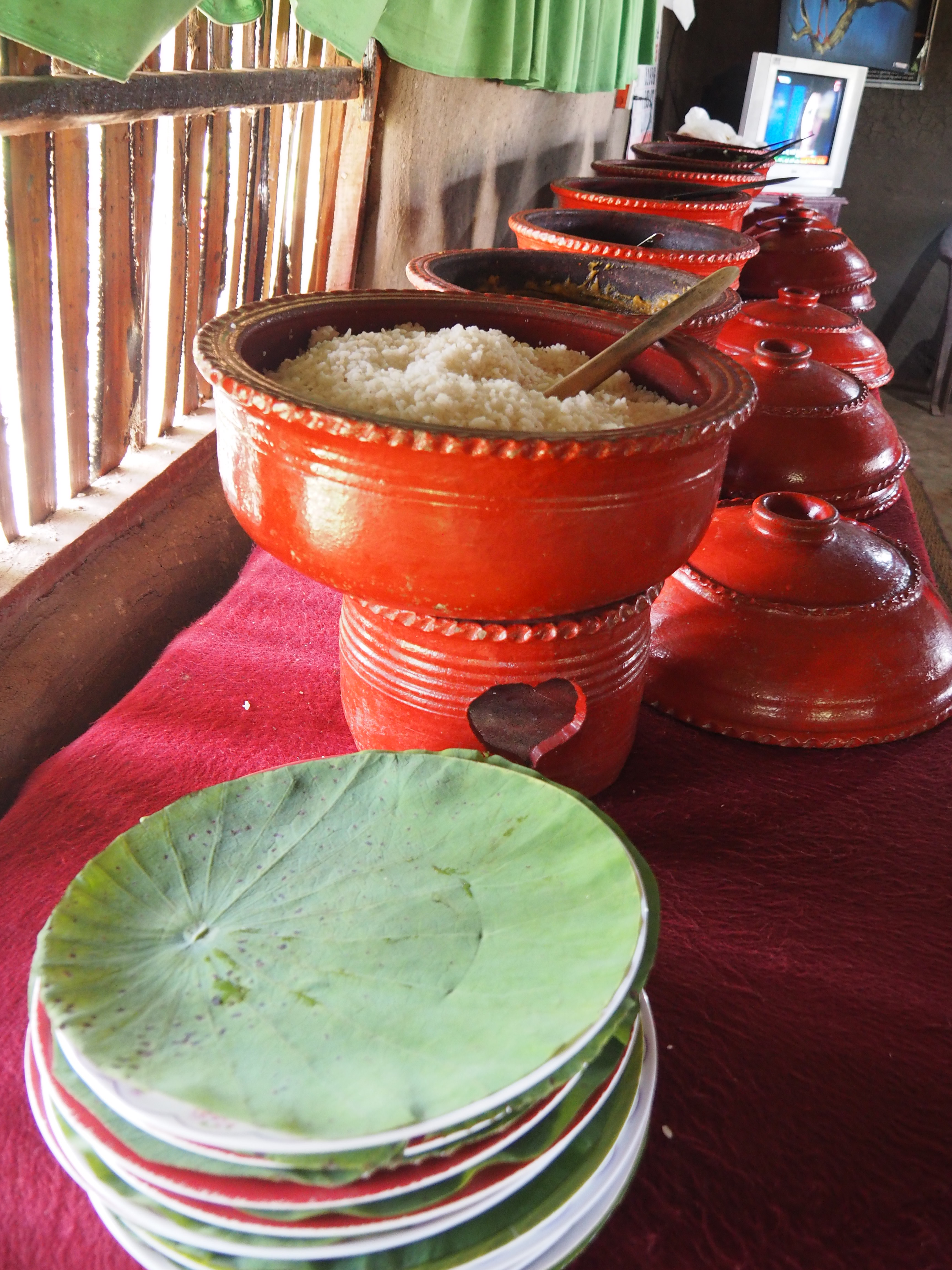 Lokalny lunch, to już dla naszego przewodnika oczywistość. Na ogół to ryż z różnymi dodatkami warzywnymi, rybami i kurczaczkiem. Mięska oczywiście jak na lekarstwo. Rodzaj szwedzkiego stołu, gdzie każdy bierze swój talerz, sprytnie owinięty folią, po to, by po zjedzeniu po prostu wyrzucić folię, a talerz pozostanie czysty i ponownie owinięty nową folią . Potem podchodzimy do kolejnych, na ogół glinianych naczyń z całą resztą propozycji kulinarnych. Nakłada sobie gość tyle ile chce i co chce. Nasze pytania do obsługi muszą być banalnie proste, bo angielski nie jest ich mocną stroną. Zadajemy więc krótkie pytanie: „spajsi” (a więc: ostre?). Osoba kiwa głową lub mówi „Wery spajsy” wtedy wiemy, że z tym czymś ostrożnie. Musimy jednak uważać, bo często ta sama potrawa, w jednych miejscach jest „medium spajsi” a w innych „spajsi”. Najbardziej zdradliwe są sosy od kurczaka lub ryby. Te potrafią zabić i być rzeczywiście ostre. A często aż prosi się pokropić sobie ryżyk takim sosikiem. Oj, można się mocno przejechać i po kilku kęsach nie czuć warg na przykład.