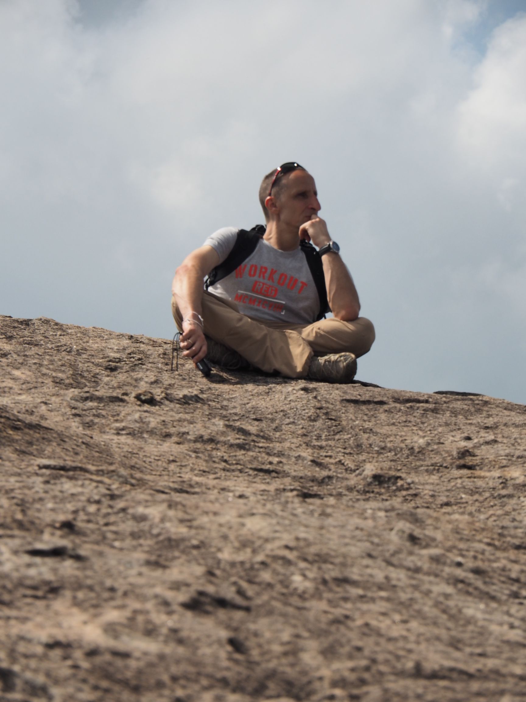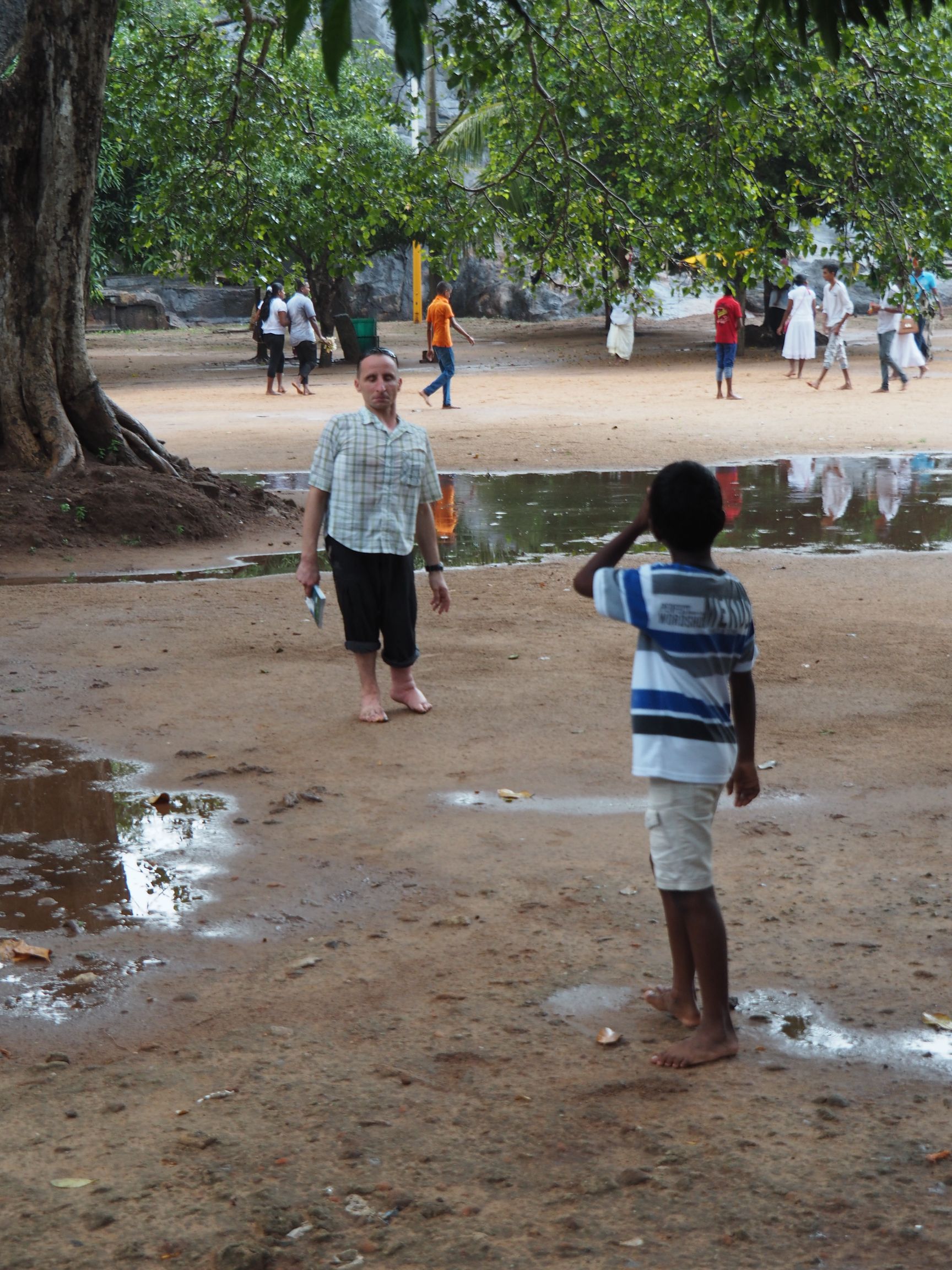 Dziś, cały dzień, po drodze z Anuradhapura do nowego miejsca naszego postoju w Sigiriya wpadliśmy na kilka godzinek do innego miejsca świętości Mihintale. To miejsce, pierwszego spotkania mnicha buddyjskiego z Indii z królem Sri Lanki. Tenże dał się namówić na Buddyzm właśnie w tym miejscu. Przy okazji, zwiedziliśmy kilka świętych miejsc, w tym to, w którym stały święte stopy Buddy, kilka pięknych widoczków… A wszystko na obszarze, wielkiej świętości – kilku ładnych hektarów, wzniesień skalnych etc, na bosaka. Łałłłł!!!!! Cierpiałem a w zasadzie moja inwalidka. Nie było mowy, byśmy wspólnie z inwalidką wleźli gdziekolwiek bez butków. Najzdrowsze stopy musiały być arcy ostrożne, wdrapując się na skały. Łaziłem więc sobie po obszarach najmniejszego ryzyka. Zasiadłem w końcu kontemplacji przed stopami Wielkiego Nauczyciela, a wszystko to w skarpetkach. Aż tu nagle lekki wiaterek, który najpierw przyniósł upragnioną ulgę, przywiał wreszcie: deszczyk, deszcz, aż wreszcie totalną ulewę, wziętą żywcem z tutejszej pory monsunowej, która winna się skończyć się już dobry miesiąc temu. W panice więc mały turysta szukał jakiegokolwiek schronienia. W pośpiechu zdjął skarpetki. Nadal mógł poruszać się tylko w obszarze zmniejszonego ryzyka dla stópki inwalidzkiej, bo każdy kamień groził jej niechybną śmiercią. Żona, opiekunka i towarzyszka najlepsza, była w tym czasie razem z Magdą i Jackiem na kolejnym skalnym wzniesieniu. I też w panice szukali schronienia przed deszczem. Znalazłem! Pod świętym drzewem, usadowiłem się wzdłuż jednego z konarów. I tak stałem dobrych kilkanaście minut. Mokry totalnie, lecz ocalony, stałem po drzewem z przewodnikiem Pascala pod pachą. Uwalony prawie do kolan od chlapiącego od ziemi deszczu. Stałem, dziwnie spokojny. Dopiero wielkie oczy Agnieszki, na mój widok mówiły dość jasno – Boże, żyjesz! A jak wyglądasz, to już druga sprawa.