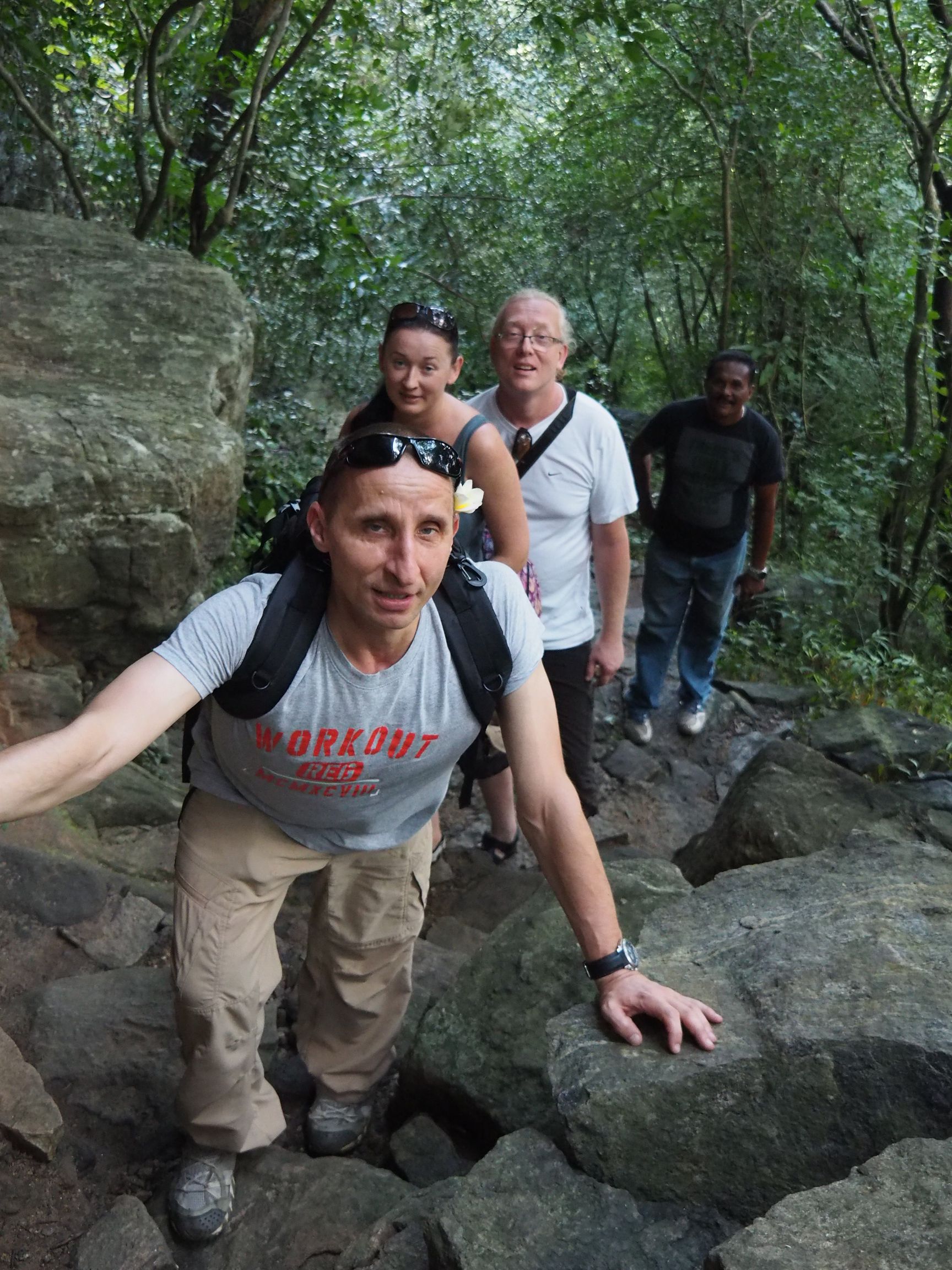 Wleźliśmy! I Pan B. był łaskawszy. Pogoda była piękna, nie za ciepło. I nieco po dziewiątej wyruszyliśmy ochoczo z naszym. Kusimim. W przeddzień pytałem go, czy dam radę na tę górkę. OK. – odrzekł i na tym kończyliśmy temat. Ważna była pogoda. Nie miało padać. Przed wejściem, pod świątynią, zgarnęliśmy jeszcze jednego „lokalsa”, który wydawało nam się przyczepił się tzw. „tipsa”. Skrót myślowy dotyczy tzw. pseudo pomocników, przewodników, którzy ofiarują ci swoją pomoc, a potem chcą pieniędzy. Opędzamy się od takich, jak tylko możemy. Ten też przez pierwszych kilka minut wydawał nam się niepotrzebny. Nic błędniejszego. Po kilkunastu minutach włażenia na skałkę, ścieżka wśród głazów okazała się tak trudna, że tylko gra zespołowa przyniosła pożądany efekt. Taki oto, że wszyscy weszliśmy. Na końcu zawsze była pomocna ręka nowego opiekuna. W pewnym momencie, jak wspominają Jacek z Agnieszką, wydawało się, że tu jest koniec świata. Wejścia były tak kręte i wysokie, że stać i płakać. Ja twierdzę, że Magda może być z siebie dumna. Przewodnicy piali z zachwytu na de mną, że dałem radę. Na górze widok był obłędny! Skałka obok, ze wspinającymi się na nią po schodach dzikim tłumem turystów była dość dziecinna i przereklamowana. Długo chwilę delektowaliśmy się widokiem z Pidarungala, wymienialiśmy się opowieściami, jak kto sobie radził. Zejście było jeszcze bardziej trudne. Znowu gra zespołowa i ręka przewodnika. Sam Kusum ledwie zipał, ale szedł za nami dzielnie. Gdy wreszcie zeszliśmy podpytałem go, ile jego zdaniem dać przewodnikowi. Bez głosu sprzeciwu, Jacek który nosi wspólną kaską, wyłożył całe 500 rupii.