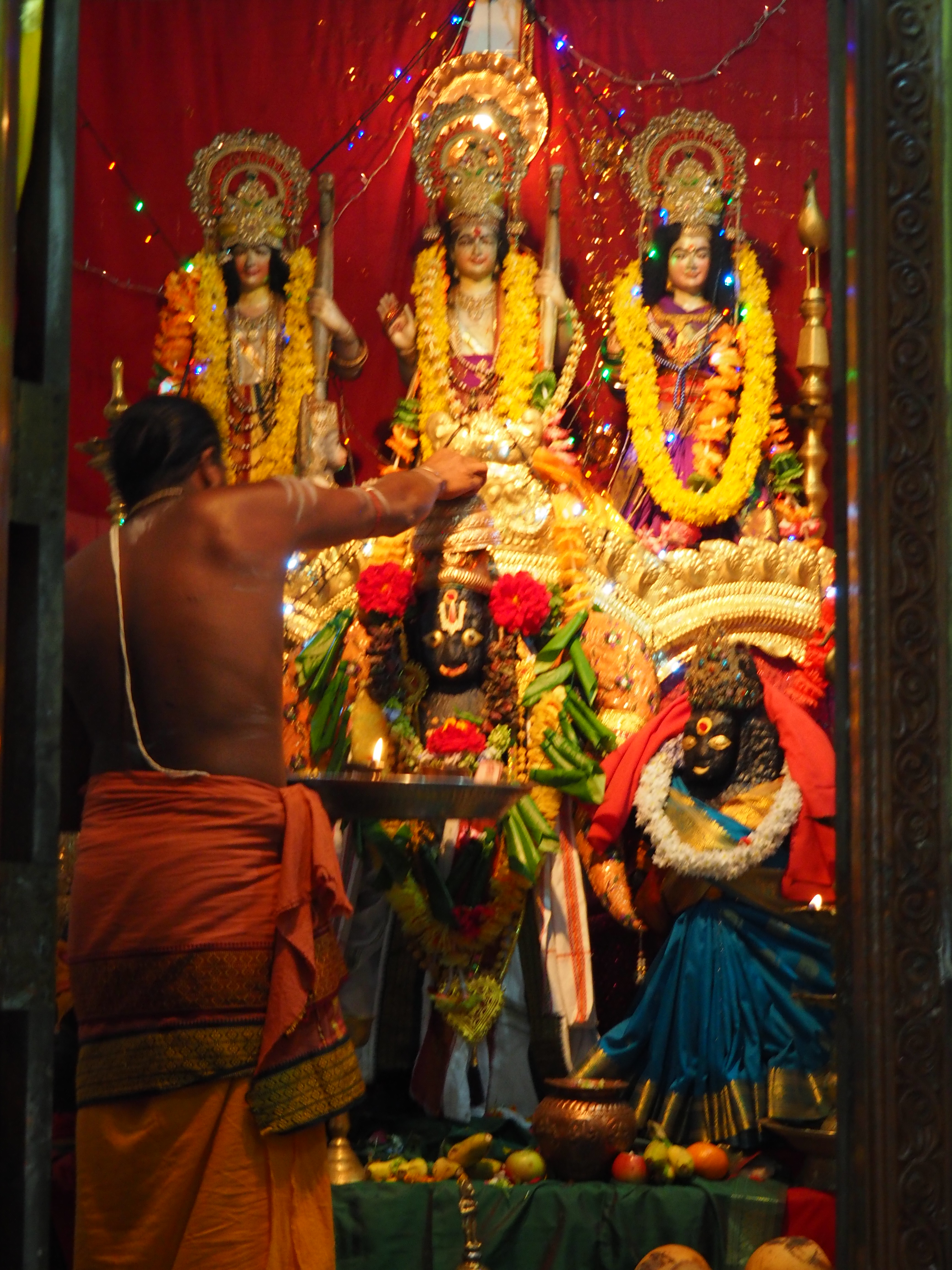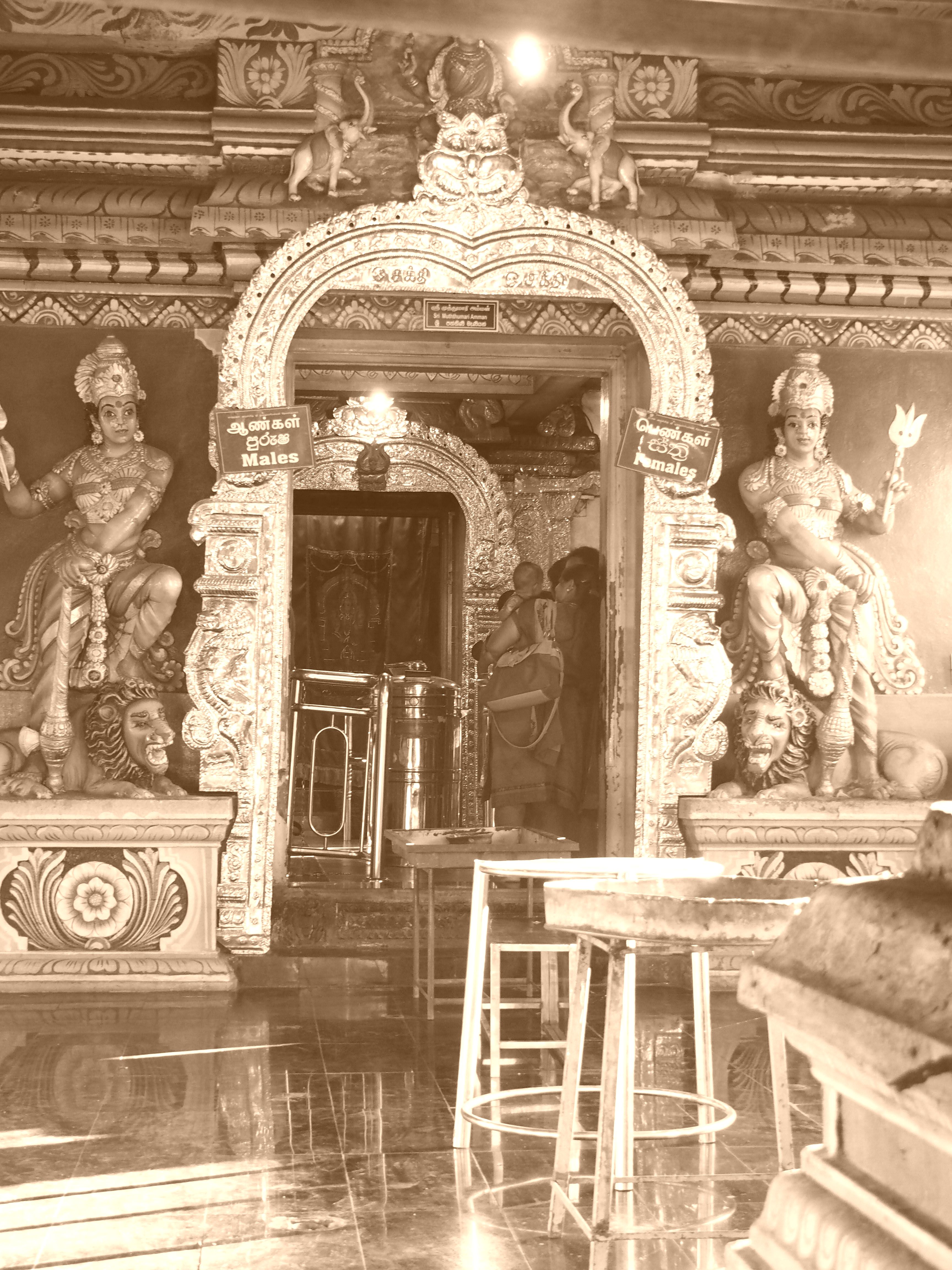 Znowu wieczór integracyjny z Kusim. Tym razem dołączył się też Zygmunt. A że był najbardziej podpity i najsłabiej mówił po angielsku, to „pojeździliśmy” sobie po nim. Śmiechu było całe mnóstwo, a biedny Zygmunt, coś tylko blebrał i usiłował coś powiedzieć… Grzecznie jednak poszliśmy spać koło 22. Następnego dnia czekało nas rano śniadanie po lankijsku. Znaczy, Kusimi dalej plusuje. Stoliki obok patrzyły z niedowierzaniem na to, co jemy. Mniej więcej koło 11 pożegnaliśmy się z zimnym hotelem i jego serdeczną i miłą obsługą, mając nadzieją na ciepełko. Po drodze ciekawa świątynia Hindu. Bardzo ważna. Kusim kazał nam koniecznie wejść, każdy został pobłogosławiony, na jego koszt. Świątynia Bogini Sita – Sriramajayam. Niezwykłe, wiele osób różnego zawodu, i wyglądu, po prostu na moment, na sekundę zatrzymywało się tu na krótką chwilę modlitwy, wkładało jakąś ofiarę i dalej w drogę.