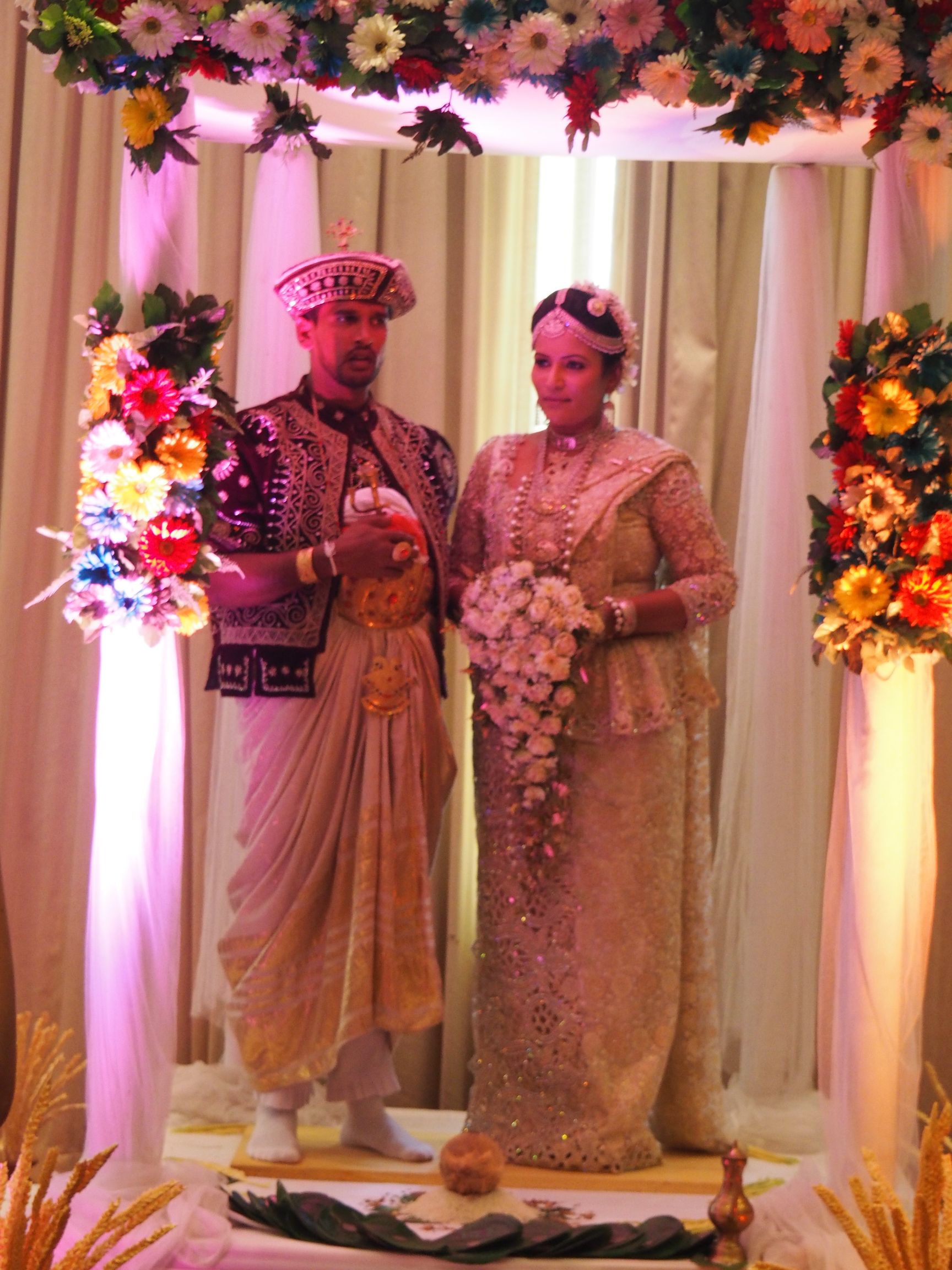 Krótko, bo też mało dzisiaj. Po porannych naukach gotowania – rybne curry, do tego sambal (opisywany wcześniej) i chlebek. Rozliczyliśmy się wsiedli do naszego busika i w drogę. Mili ludzie, najsympatyczniejszy rodzinny hotelik, jak do tej pory. Już Kandy położone jest nieco wyżej, co odczuć można choćby temperaturowo. W nocy temperatura spada, do niewiarygodnie niskiej – 23 st. C. W nocy sypialiśmy bez klimy i wentylatora, co nam się nie zdarzało do tej pory. Poprosiliśmy również o koc, z którego korzystaliśmy nad ranem. Do tej pory okryciem we wszystkich pokojach hotelowych były po prostu prześcieradła. Zanim jednak wyjechaliśmy z Kandy, wprosiliśmy się na ślub. Przejeżdżaliśmy właśnie obok jakiejś remizy – pałacu ślubów, gdzie przyciągnęły uwagę naszą tańczące postaci, podobne do tych oglądanych wczoraj. Kusumi natychmiast zaprosił na, byśmy poszli za orszakiem weselnym. Nieco wstydząc się, czy wypada ruszyliśmy w końcu. I doszliśmy aż do Sali weselnej, gdzie młodzi właśnie zawierali związek małżeński. Był oczywiście mistrz ceremonii. Młoda para, w pięknych tradycyjnych strojach. Goście weselni w pełnej gali. Zgodnie orzekliśmy z Jackiem, że tyle pięknych Lankijek nie widzieliśmy przez cały pobyt na Sri Lance. Kobiety w tradycyjnych sari, mężczyźni w europejskich garniturach. Podniosły nastrój. Naszemu Kusiemu, wymknęła się nawet łezka, a to gdy dziewczynki śpiewały jakąś pieśń. Oczywiście śpiewał pod nosem z nimi. A to znów, gdy mistrz ceremonii, mówił podobno o matce panny młodej. Ceremonia zaślubin trwała dobre pół godziny. Potem zbierali się goście i zacząć miało się wesele. Wszyscy obecni byli bardzo zaskoczeni naszą tam obecnością. Nie mieli nic przeciwko temu. Uśmiechali się, zagadywali, próbowali coś wyjaśniać. A już szczytem gościnności, było, gdy jedna z Pań zwróciła się do Agnieszki z propozycją, byśmy zostali na poczęstunku. Bardzo miło. Serdecznie podziękowaliśmy i wyszliśmy. W pałacu miejsce miało jeszcze kilka takich ślubów. Przed pałacem towarzyszyła im rzeczywiście spora grupa ciekawskich białasów, ale tylko my weszliśmy aż tak daleko i towarzyszyliśmy zaślubinom do samego końca.