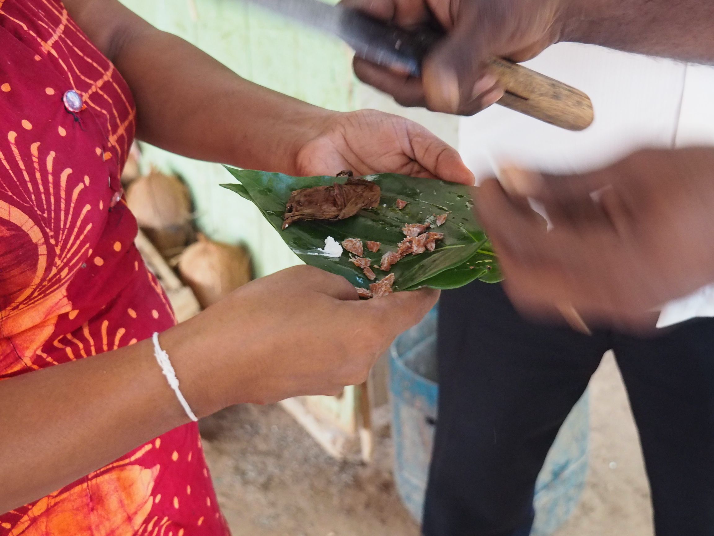 Najpierw było śniadanie. To już nasz kolejny hotel i przyzwyczailiśmy się już, że podchodzi do nas mniej lub bardziej rozgarnięty kelner i pyta: tee, coffe, omlet. To standard w 90 proc. hoteli proponowane jest śniadanie europejskie. Kawa, herbata tosty i do tego jakieś jajka, w tej lub innej formie. Plus, oczywiście, jakieś owoce w formie podanej lub z soku. Ja zawsze proszę o jajko gotowane (boiled eggs) i to stanowiło moja/nasze poranne od początku pobytu. Zamarzyło więc się nam śniadanie w stylu lankijskim. Wyczuliśmy, fajnych gospodarzy w hotelu w Kandy, otwartych, serdecznych, szczęśliwych, że pytamy o ich kuchnię. Poprosiliśmy, by rano nie podawali nam tostów, tylko coś własnego. Schodzimy rano a tam niespodzianka. Niemcy, stolik dalej, wtryniali swoje tościki, a my tymczasem placuszki ryżowe, do tego jajka ugotowane i podane w sosie carry z mlekiem kokosowym i do tego sambal – roztarte chili sól, wiórki kokosowe i limonka. Najedliśmy się, wychwaliliśmy żonę gospodarza i poprosiliśmy o coś na kolację.