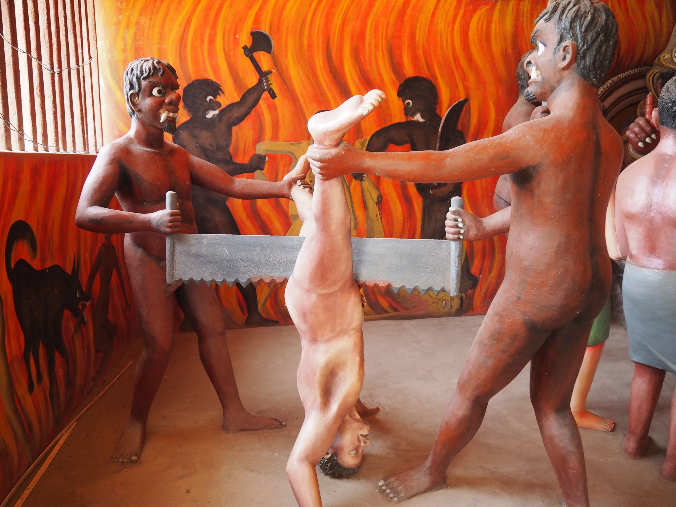 Całość podlana tutejszy miodem. I zaprawdę powiadam wam, było to pyszne. Spałaszowaliśmy należny nam garnuszek i poprosiliśmy o jeszcze. I na dodatek zagadnąłem Kusumiego, że chcielibyśmy kupić małą buteleczkę takowego miodu. Byleby był dobry, prawdziwy i z niewielką ilością cukru. Ten, pomruczał coś z wieśniaczką. Po czym potwierdził, że jej miód jest dobry. Nabyliśmy więc uradowani po flaszeczce miodu i popędziliśmy dalej. Po drodze świątynie, bo a jakże. Kusumi wie, że kronikarz wycieczki, to lub najbardziej. Wevurukannala to miejsce, w którym znajdziemy największy posąg Buddy medytującego na wyspie. Lankijczycy generalnie lubują się w kwestii buddyzmu, określeniem „naj”. Największe, najstarsze, najpiękniejsze. W świątyni, prócz wspomnianego posągu, na który nawet można było wejść, co część wycieczki oczywiście uczyniła, kilku kapliczek i mniejszych posągów, odwiedziliśmy swoistą galerię. Dotąd myślałem, że buddyści nie uciekają się do straszaków, typu: ognie piekielne, smoły i temu podobnych doznań rodem z redniowiecza. Myliłem się. Już przewodnik Pascala pisze, że wprowadzanie tu dzieci, może być dalece nie wskazane. Szereg malunków i rzeźb mających być przestrogą, dla tych wszystkich, którzy nie stosują się do nauk Buddy. Kolejne malunki objaśniają konkretnie, co czeka „grzesznika” jeśli nie wykonana jakiegoś przykazania. Same konkrety, można się przestraszyć. Nasz przewodnik uśmiał się oczywiście i powiedział, by nie brać zbyt serio tych malunków, że są one raczej formą „kija”, dla najmłodszych wyznawców buddyzmu i ciekawostką malarską. Po drodze jeszcze jedna świątynia, mniej znacząca – Sri Rohana, potem mały postój w nieciekawym miejscu na małą przekąskę. Tu Kusumi wybrał nieciekawie. Dworzec autobusowy, białasów jak mrówków i stado Lankijczyków, z ich straganami usiłującymi wcisnąć jakąś przekąskę. Najczęściej roti – rodzaj placka w rożnej wersji, wegetariańskiej, jajecznej etc. Często po drodze jadamy właśnie roti. Mnie najbardziej smakowało zwykłe roti, w formie placka i do tego pioruńsko ostra pasta z chili. Oczywiście pasty jeno odrobina, bo większa ilość może być zabójcza.