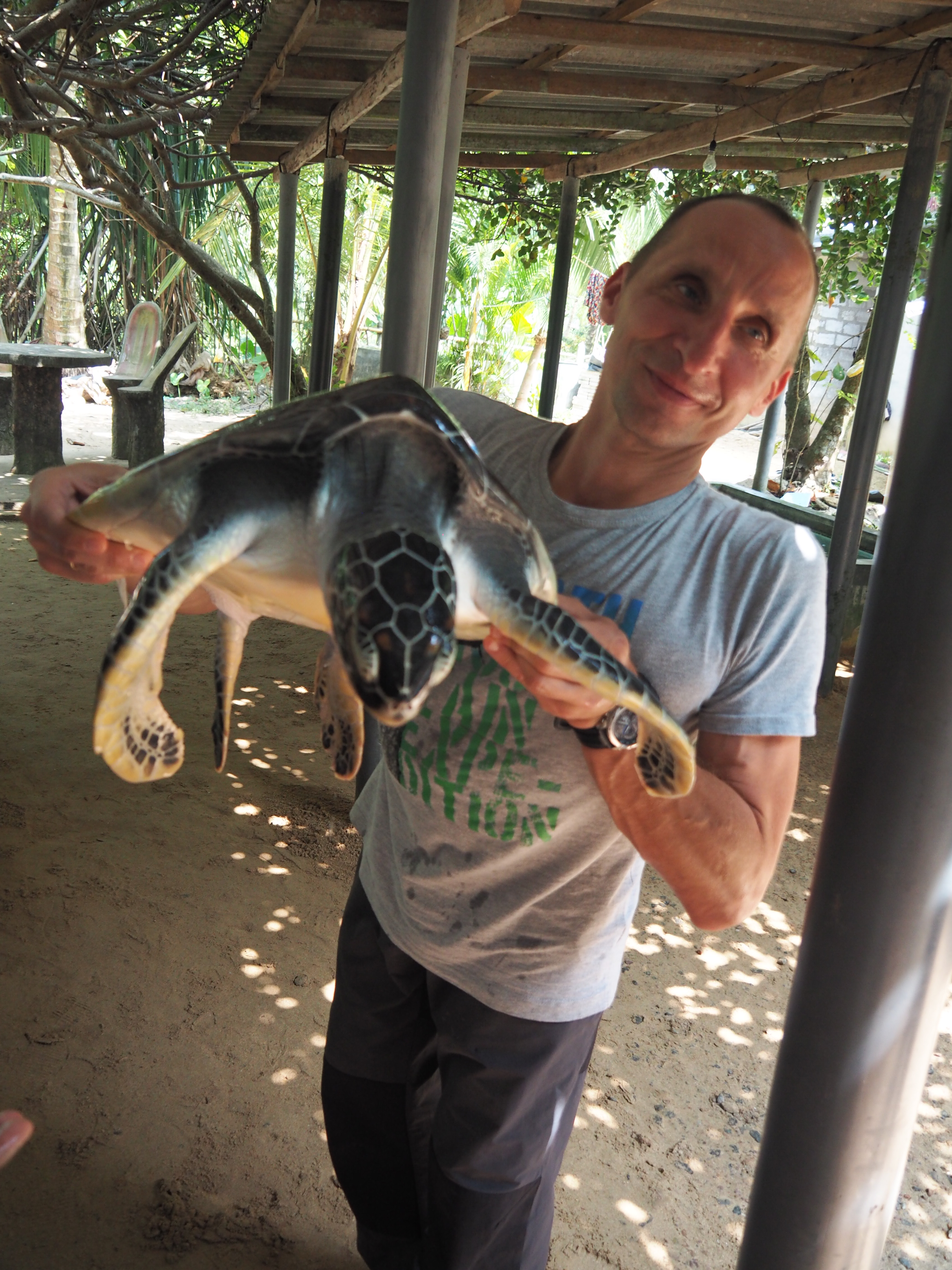 Kierując się dalej na południe mieliśmy jeszcze zobaczyć żółwie. Miejscowość Kosgoda słynie z takich żółwich przystani. To takie pół charytatywne przedsięwzięcia, żyjące z biletów i podarków od turystów. Ratują żółwie i wspomagają rozwój ginących gatunków. Na Sri Lance żyje bowiem kilka gatunków żółwi, nawet do takich, które mierzą ponad trzy metry długości. Okoliczni rybacy, za niewielką opłatą znoszą im więc żółwie, żółwiki i jaja tych stworzeń, które znajdą na plaży. Za każde takie jajo otrzymują symboliczną zapłatę 20 rupii. Znoszą i te, które złapią im się w sieci rybacki. Ludzie ratownicy, pozwalają jajom wykluć się a potem, po krótkiej inkubacji, wypuszczają te maleńkie żółwiki do wody. Zacny to cel i nie poskromiliśmy grosika by wspomóc tych ludzi. Zwłaszcza, że mogliśmy jeszcze poznać innych starszych pensjonariuszy tegoż inkubatorium. Mogliśmy wziąć na ręce ich podopiecznych. Połaskotać, spojrzeć głęboko w oczy. Poznaliśmy też żółwia, który – jak nam wytłumaczono, śmiejąc się – korzysta z opcji „All inclusive”. Wraca, do maleńkiego baseniku, mimo że proponuje mu się wolność.